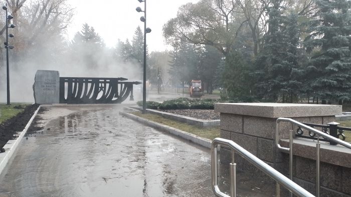 Сегодня рабочие отмывали памятники и бюсты, установленные в сквере. Для очистки крупных монументов использовали поливомоечные машины, по гранитным плитам прошлась спецтехника малых габаритов.