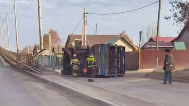 На окраине Омска после столкновения с ограждением перевернулся мусоровоз