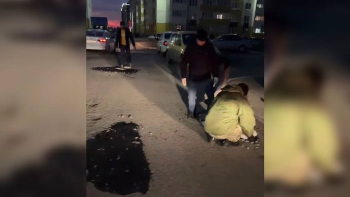 На кадрах видно, как омичи ночью залатывают ямы, образовавшиеся на дорогах. Местные жители рассказали, что для ремонта полотна собрались жильцы трех домов.