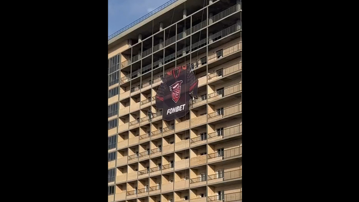 Длина джерси достигает около трех этажей, то есть примерно 10 метров. Монтаж полотна завершают рабочие.