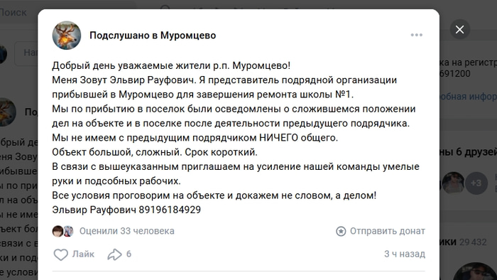 – Мы не имеем с предыдущим подрядчиком НИЧЕГО общего. Объект большой, сложный. Срок короткий. В связи с вышеуказанным приглашаем на усиление нашей команды умелые руки и подсобных рабочих, - написал представитель подрядной организации, прибывшей в Муромцево для завершения ремонта школы № 1.