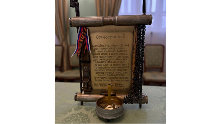 Поэтический презент, преподнесенный в честь юбилейной даты – 80-летия Великой Победы, представляет собой уникальную инсталляцию «Отечество мое». Она выполнена из настоящих гильз, штыков и копий, а также украшена стихами автора.