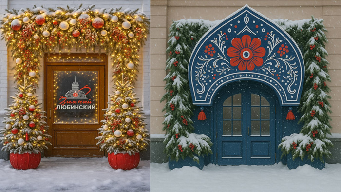 Для праздничного оформления планируется использовать классические русские мотивы: кокошники, резные наличники, морозные узоры, гроздья рябины со снегирями, а также изображения солнца и коней. Цветовая гамма – красный, глубокий синий, снежно-белый, коралловый и бежевые оттенки.