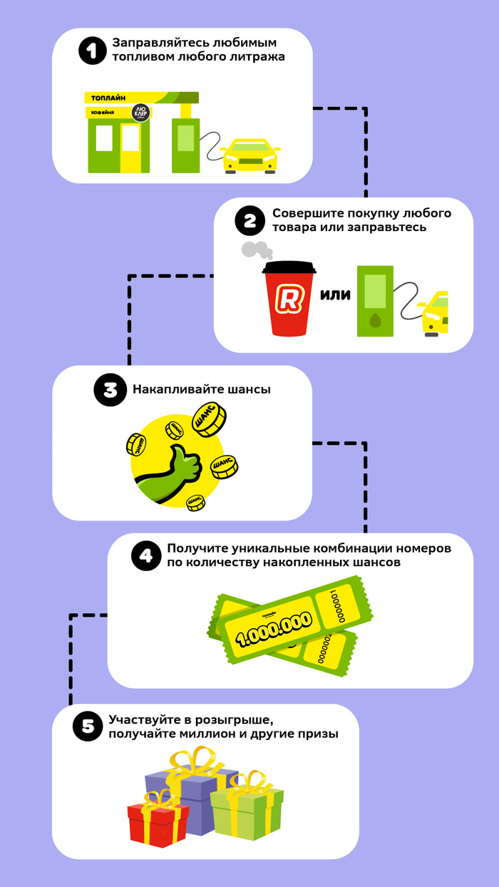 Чем больше покупок, тем выше ваши шансы! За каждый литр топлива (АИ-92, АИ-95, ДТ, R ДТ, АИ 98, КПГ-метан и СУГ) вы получаете один виртуальный балл, который равен одному шансу. А за каждый литр фирменного топлива Reactive – целых два шанса! Покупаете напитки, блюда бистро или товары собственной торговой марки? Получите от 2 до 3 шансов за каждый товар! И конечно, за любые другие сопутствующие товары начисляется 1 шанс за каждые 100 рублей в чеке.