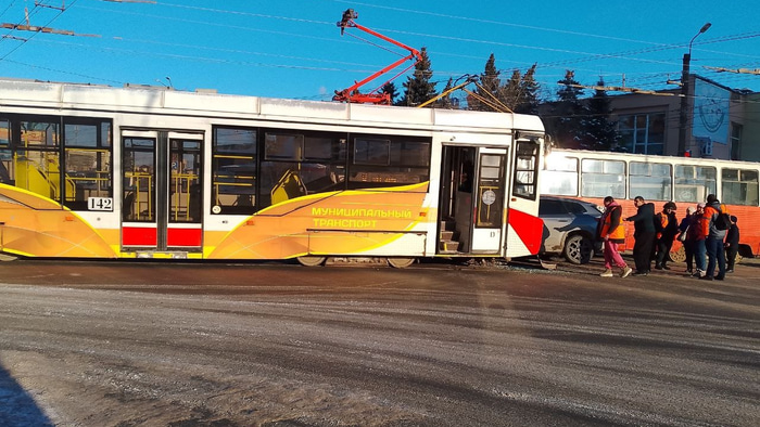 В соцсетях появились фотографии с места аварии на проспекте Карла Маркса. Легковой автомобиль BMW с номерами «555» оказался зажат между двумя трамваями.
