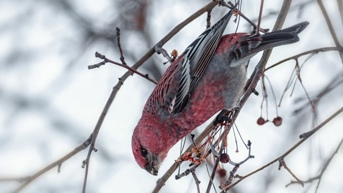 Щур из семейства вьюрковых, один из крупных родственников клестов и снегирей: самцы с малиновыми перьями, самки – желто-зелеными.