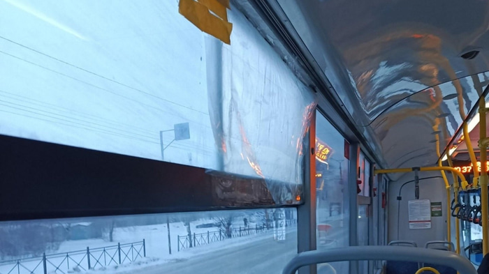 Омичи пожаловались в соцсетях на сквозняк в автобусе № 67. Вместо стекла пассажиры обнаружили в транспорте пленку, приклеенную скотчем.