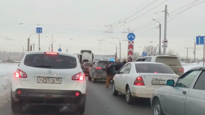 В Омске на мосту у Телецентра произошла массовая потасовка прямо посреди автомобильной пробки. Инцидент попал на камеру и распространился в социальных сетях.