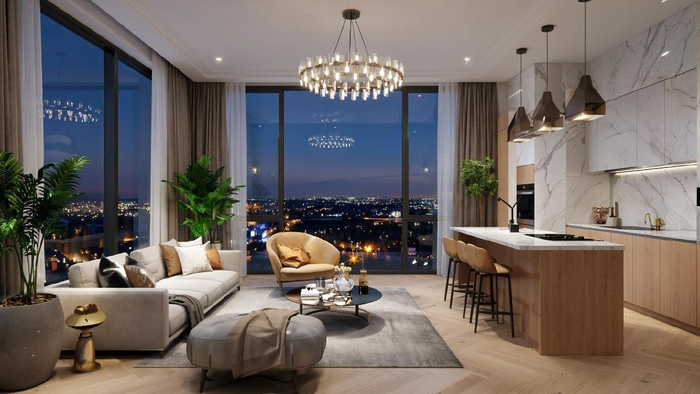 – Квартира двухуровневая (пентхаус). Проект предполагает просторную зону коридора, светлую гостевую с кухней. Роскошные санузлы. Две детские комнаты, а также большую спальню. Предусмотрены места для хранения и рабочие зоны, – указано в объявлении.