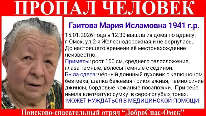 Сегодня, 15 января, в Омске пропала пенсионерка Мария Гаитова, 1941 года рождения. Как сообщили в ПСО «Доброспас-Омск», она вышла из дома по адресу: ул. 2-я Железнодорожная в Октябрьском округе и до сих пор не вернулась.