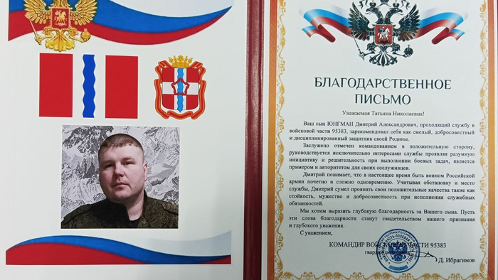 Мать Дмитрия Юнгмана Татьяна Николаевна получила не только медаль, но и благодарственное письмо от командира воинской части.