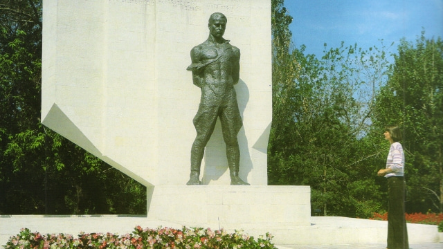 Постаменты у монументов, кстати, были разные. Венгерский Лигети стоит на фоне знамени, которое выполнено из розового мрамора.