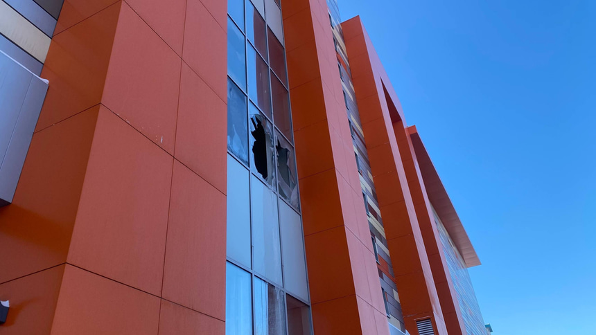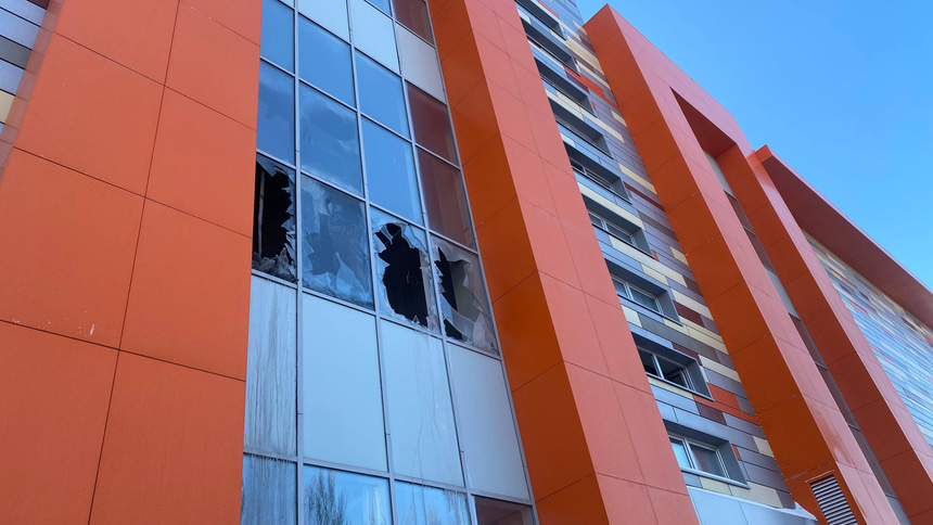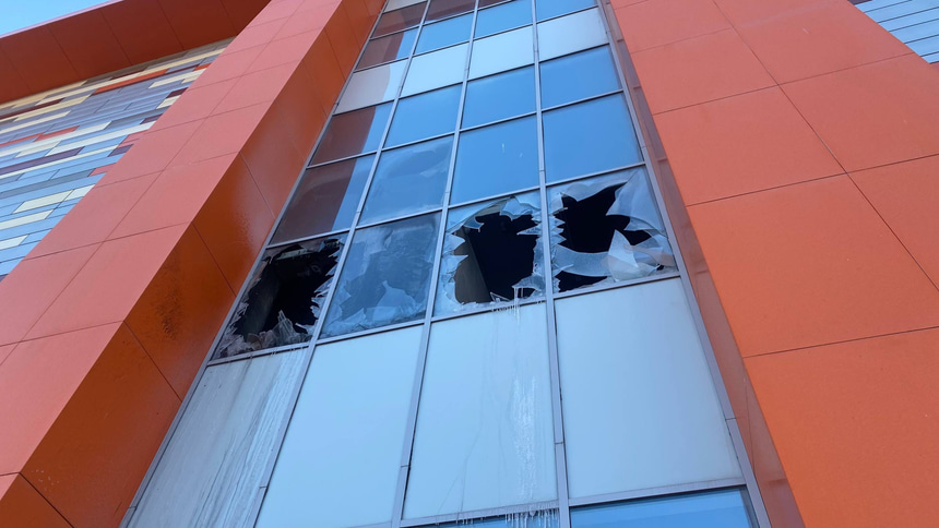 С левой стороны здания на 2-м этаже были разбиты стекла, а на тротуаре лежали осколки.