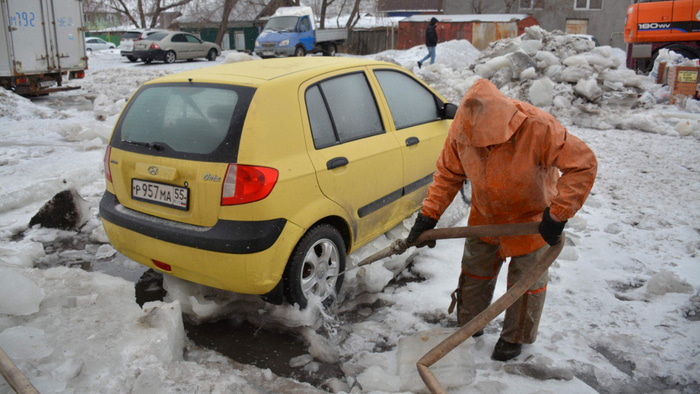 Так, сотрудники водоканала отказались от грубых методов и отложили ломы в сторону. Машину решено было вымораживать изо льда, используя теплую воду из специальной цистерны.