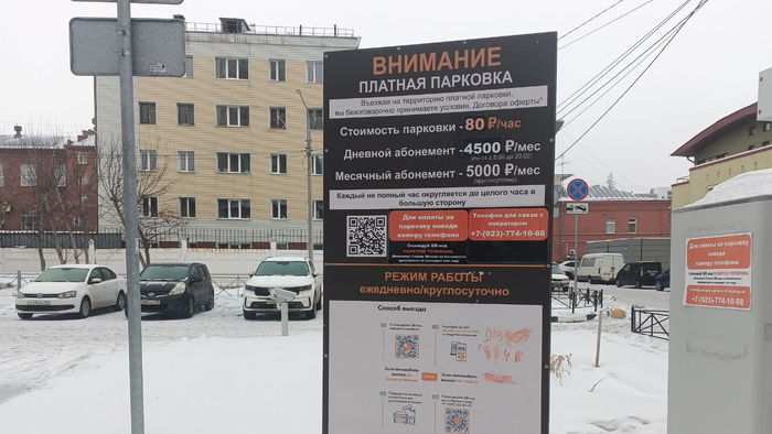 Стоянка автомобиля на уже действующих платных парковках в центре Омска действительно,обходится недешево. На въезде водителей встречает информационный щит с тарифами: час парковки стоит 80 рублей. Также предусмотрены абонементы – дневной, действующий по будням с 8:00 до 20:00 и стоимостью 4 500 рублей в месяц, и круглосуточный – за 5 000 рублей.