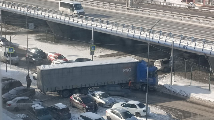 Под метромостом в Омске, в районе Красного Пути, произошла авария. Как сообщают очевидцы, фура полностью заблокировала дорогу.