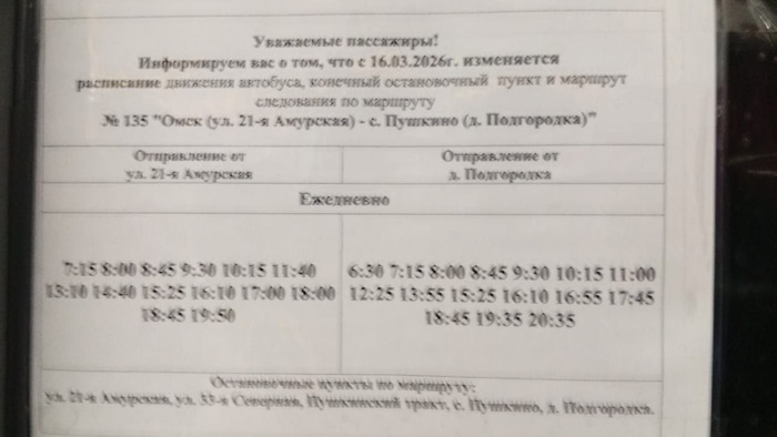 Жители деревни Подгородки Омского района столкнулись с переменами в работе общественного транспорта. В салонах автобусов популярного маршрута № 135 появилось объявление о том, что с 16 марта схема движения существенно сократится.