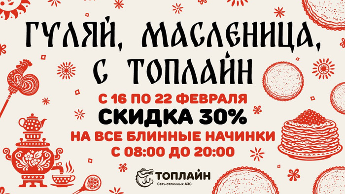 Сеть автозаправочных станций «Топлайн» проводит праздничную акцию, посвященную Масленице. С 16 по 22 февраля все клиенты могут воспользоваться скидкой 30 % на блинные начинки. Предложение действует ежедневно с 8:00 до 20:00 на всех АЗС сети, оборудованных блинными «Люклер Авто».