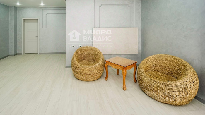 Продавец также отмечает, что квартира полностью укомплектована. Однако на фотографиях видно, что из мебели присутствуют только стол и два плетеных кресла.