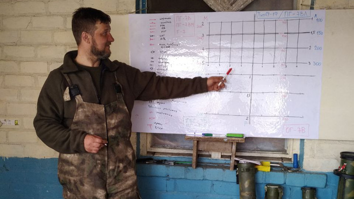 Дмитрий Шарушинский проводит занятия для добровольцев, в качестве учебной доски – дверь