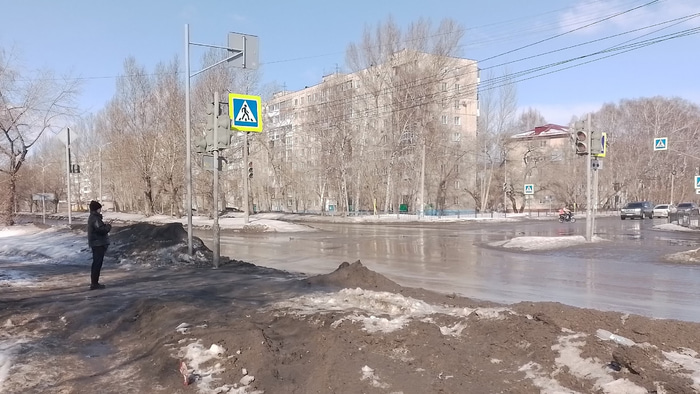 Сегодня омичи плывут по улицам вместе с реками талого снега. На дороге месиво из льда, воды и реагентов.