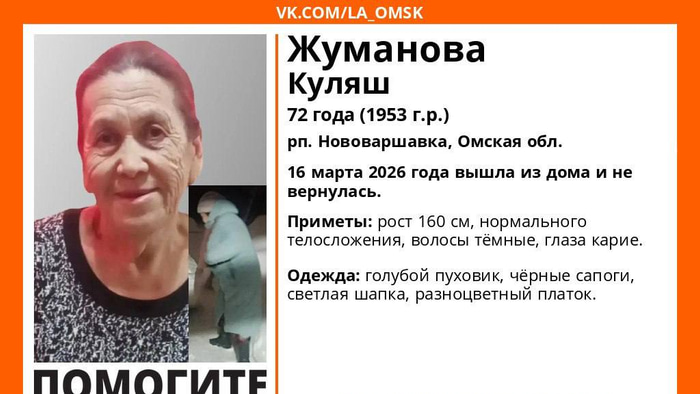 В поселке Нововаршавка Омской области пропала 72-летняя Куляш Жуманова. Как сообщили в добровольческом поисково-спасательном отряде «ЛизаАлерт», в понедельник, 16 марта, она вышла из дома и до сих пор не вернулась. Поисками занимаются родственники, полиция, волонтеры и неравнодушные жители.