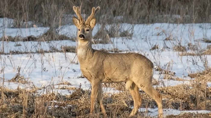 Инспектору удалось запечатлеть как минимум три особи косули. Животные выглядят здоровыми и упитанными. Примечательно, что один из самцов косули, попавший в кадр крупным планом, продемонстрировал удивительную грациозность. «Модель» замерла в элегантной позе, словно специально позируя для фотографа, что позволило сделать высококачественный снимок.