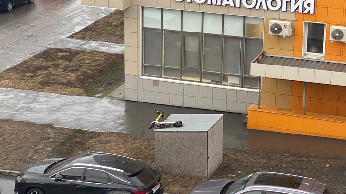 Судя по фотографии, прохожие или пользователи самоката закинули транспортное средство на крышу закрытой площадки с мусорным контейнером.