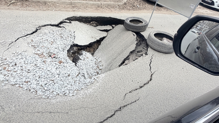 Провалился асфальт: омская дорога внезапно сузилась до одной полосы